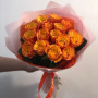 На фото 15 оранжевых роз. В составе: роза 15 шт, дизайнерская упаковка 2 шт, атласная лента 2 шт, . Все цветы свежие и ароматные, букет красиво оформлен и отлично подходит для подарка. Доступна доставка цветов или самовывоз.