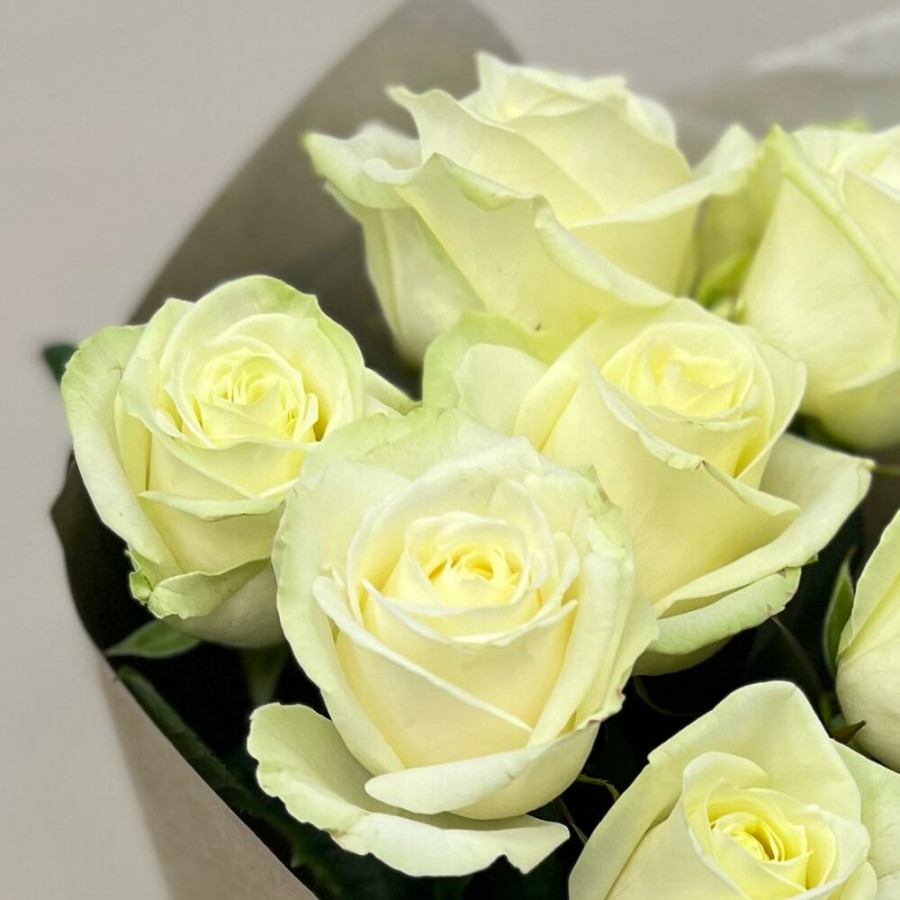 На фото букет из 7 белых роз. В составе: роза 7 шт, крафт-бумага 1 шт, атласная лента 1 шт, . Все цветы свежие и ароматные, букет красиво оформлен и отлично подходит для подарка. Доступна доставка цветов или самовывоз.