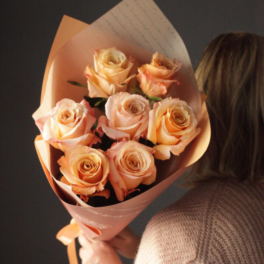 На фото букет из 7 персиковых роз. В составе: роза 7 шт, дизайнерская упаковка 1 шт, атласная лента 1 шт, . Все цветы свежие и ароматные, букет красиво оформлен и отлично подходит для подарка. Доступна доставка цветов или самовывоз.